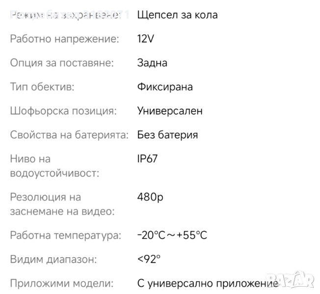 - 8 светодиода на инфрачервената камера за нощно виждане - 7 метра удължителен кабел - захранване през запалката на автомобила, 12V - водоустойчива IP67 - прахоустойчива