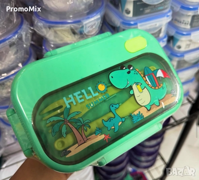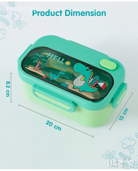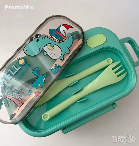 Детската кутия за храна с дизайн на весел динозавър е чудесен избор за ежедневна употреба в училище, на екскурзии, пътувания, пикници и др.
