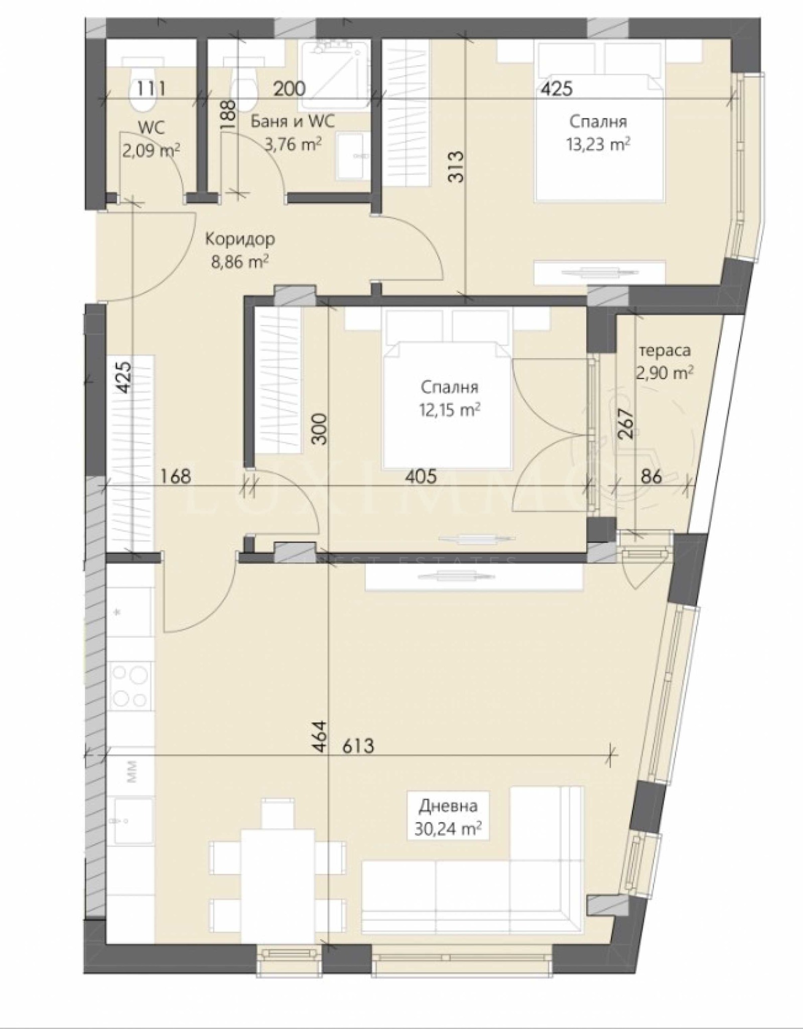 тераса- 2.90 кв.м.Жилището се предава в степен на завършеност по БДС: