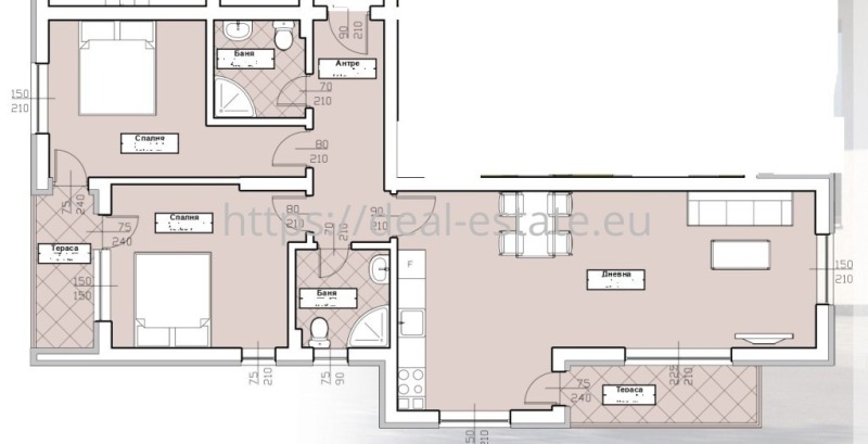 Разпределение: входно антре, дневна с кухненски бокс, две спални, два санитарни възела и две тераси.