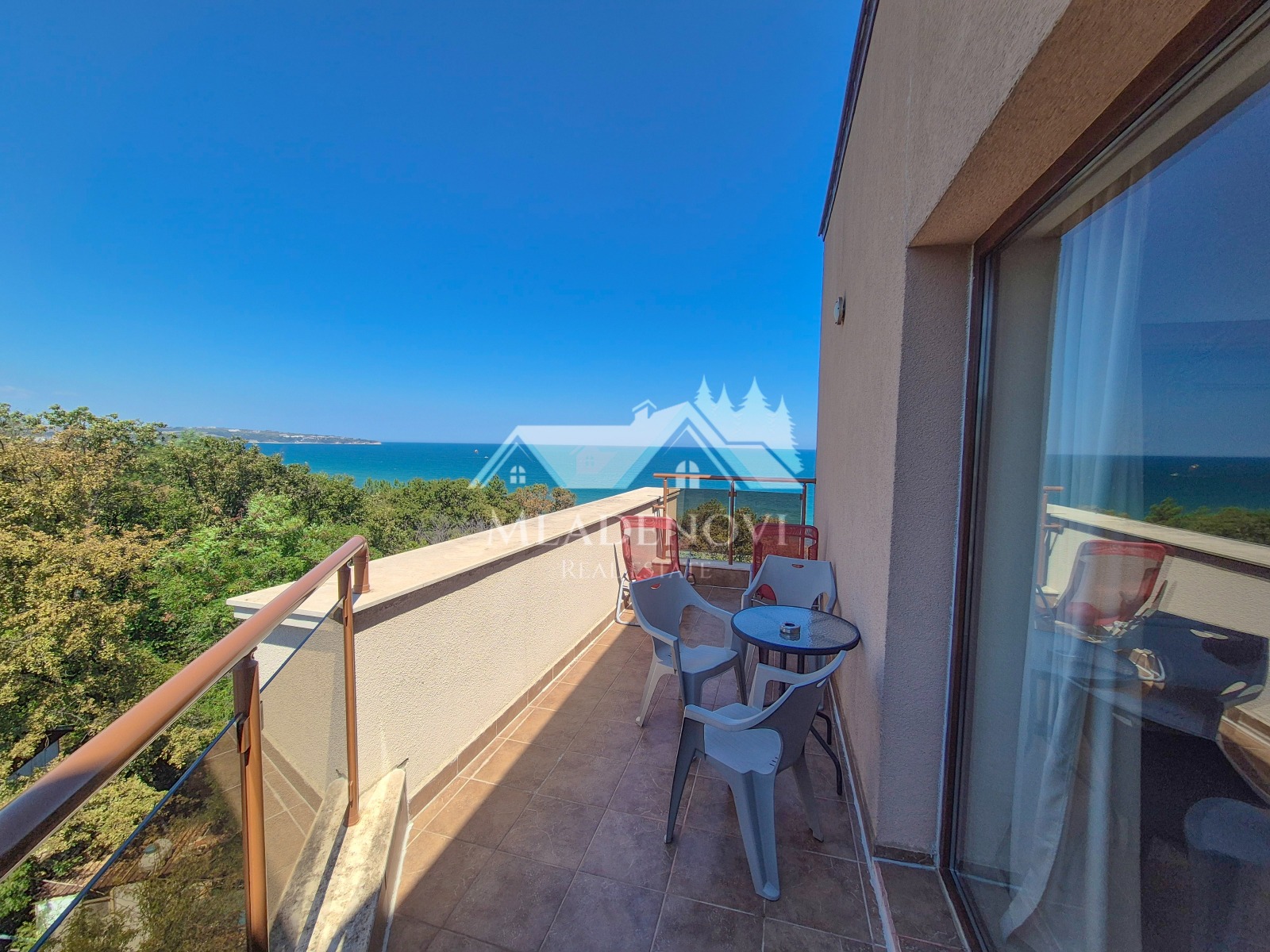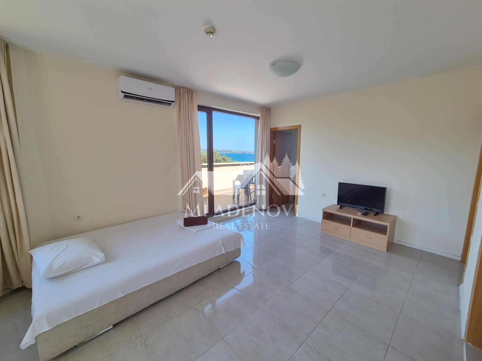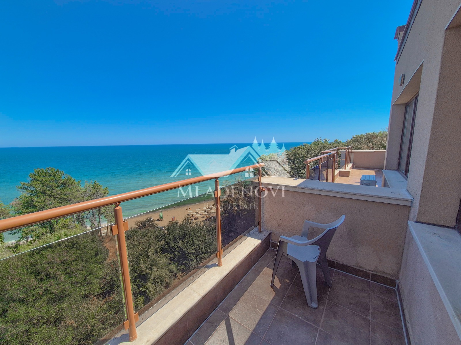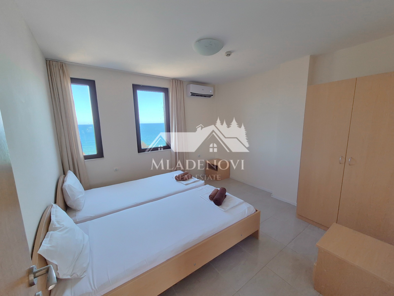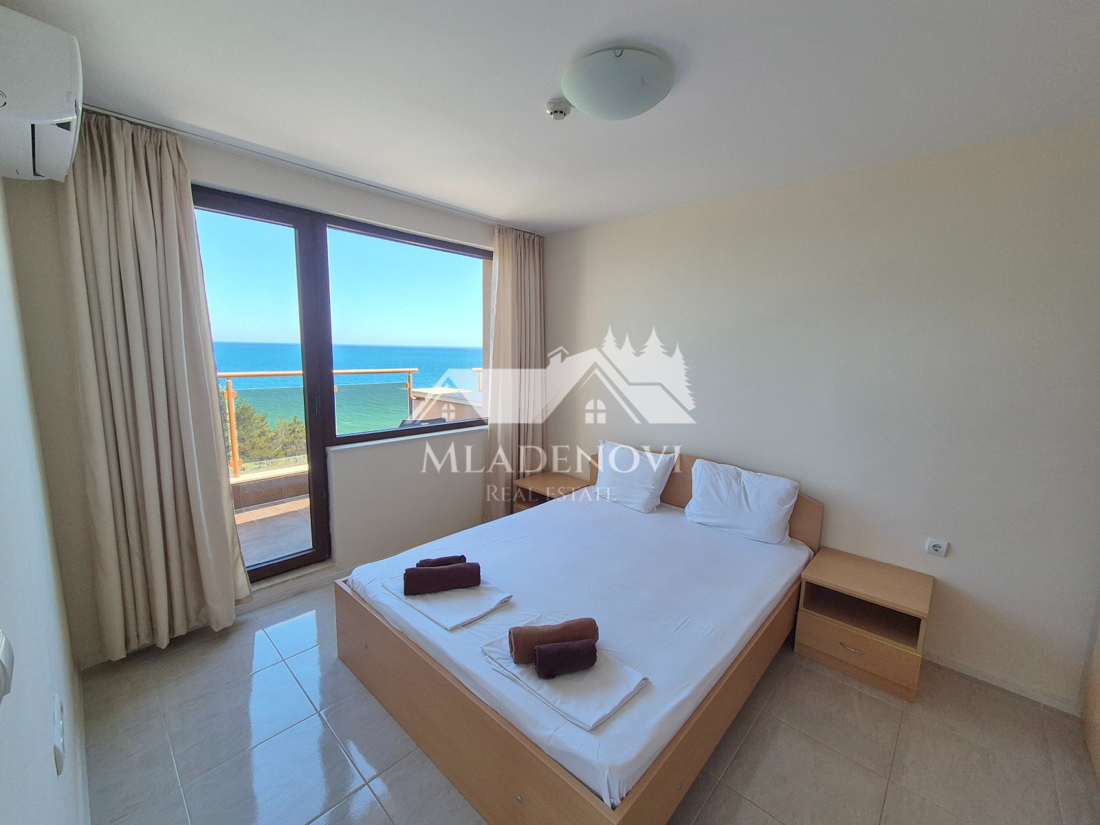 Обзор. На територията на комплекса има басейн, ресторант и кафене на пешеходно разстояние. Осигурена е и денонощна охрана и видеонаблюдение. Достъпът до плажа е лесен и удобен. Имотът се състои от всекидневна с кухненски кът, две тераси, една по-малка и една по-голяма, от която се открива красива гледка към морето, две самостоятелни спални, като една от тях има трета тераса с уникална гледка и баня с тоалетна. Продава се с наличното обзавеждане и оборудване. Във всяка стая има монтирани климатици. Възможност за закупуване на паркомясто в подземен паркинг на сградата. Таксата поддръжка е 12 Евро/кв.м. без ДДС. Имотът е подходящ за закупуване, както с цел за лично ползване, така и за инвестиция, с цел отдаване под наем и нощувки, което се предлага като услуга от управляващата компания.