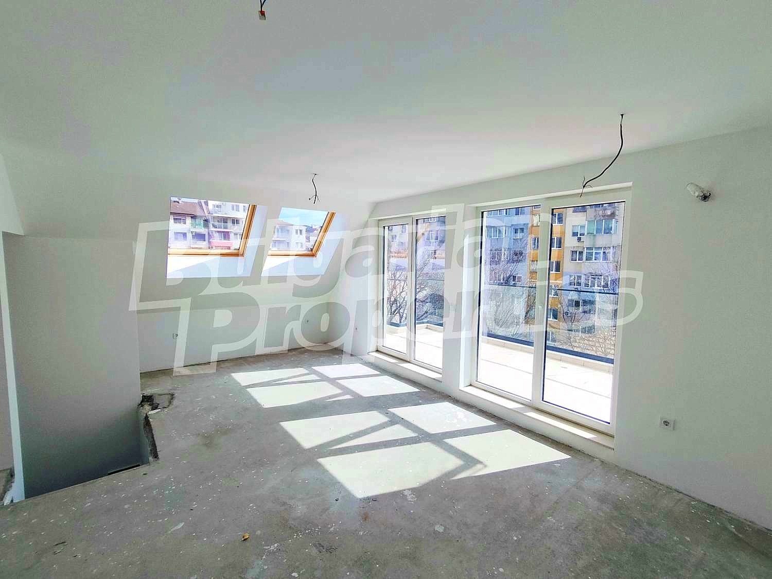 Апартаментът се намира на четвърти и пети етаж от общо пет, в новопостроена тухлена сграда с асансьор. Имотът е с обща площ от 117 кв. м., от които 102 кв. м. чиста жилищна площ, разпределени между две нива, така че да осигурят максимален комфорт, функционалност и усещане за уют.