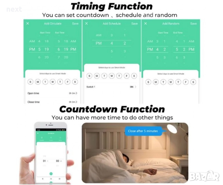 + Контрол на мобилното ПРИЛОЖЕНИЕ: Контролирайте включването и изключването на устройството, времето, обратното броене и други функции през мобилния телефон. Докато мобилният телефон има мрежа, превключващият модул у дома може да се управлява глобално.