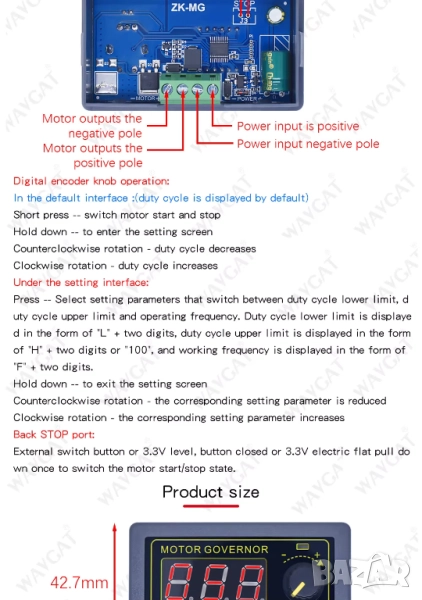 Компактен и ефективен регулатор за управление на скоростта на DC мотори! С широк обхват на входно напрежение и способност за работа с ток до 5A, този PWM контролер е идеален за роботика, модели и всякакви applications с малки и средни DC мотори.