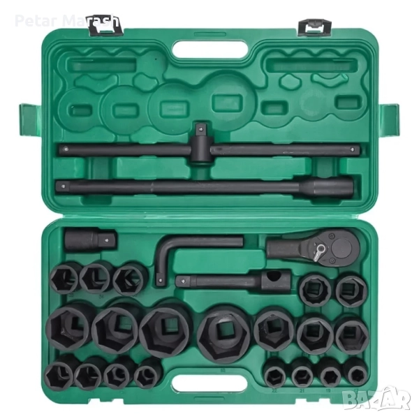 Този комплект е създаден за тежкотоварни превозни средства, камиони и индустриални машини, където е необходима максимална здравина и надеждност. Със своите 20 ударни вложки в диапазон от 21 до 65 мм, тресчотка, T-образен върток и допълнителни аксесоари, той покрива всички основни нужди на професионалния механик.