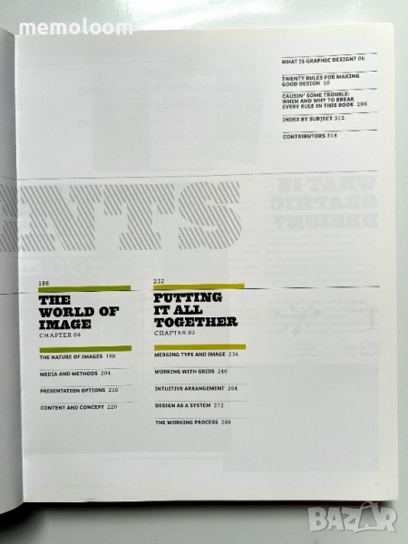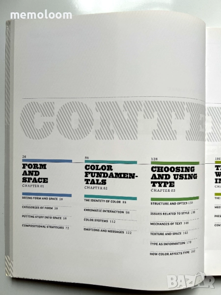 Графичен дизайн / визуална комуникация: Книгата представя базови концепции като решетки (grids), визуална йерархия, композиция, типография, цвят, изображение, и начините, по които дизайнът работи като визуален език