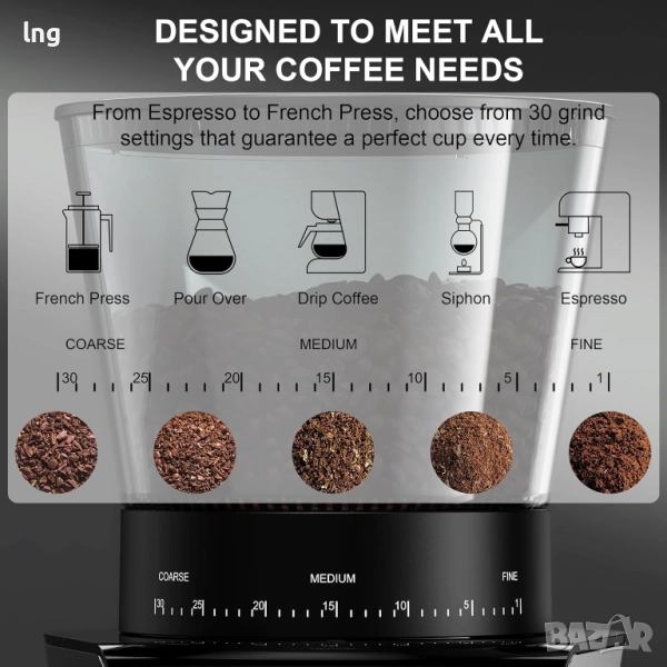30 степени на смилане: Предлага 30 точни настройки за смилане – от изключително фино за еспресо до едро за френска преса. Моторът с редуктор минимизира генерирането на топлина, запазвайки вкуса и аромата на зърната.