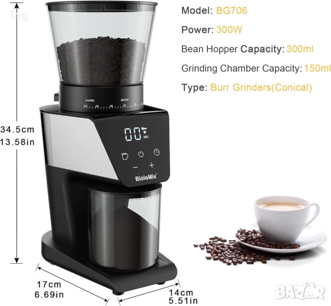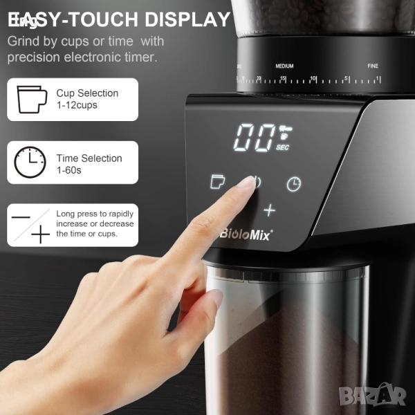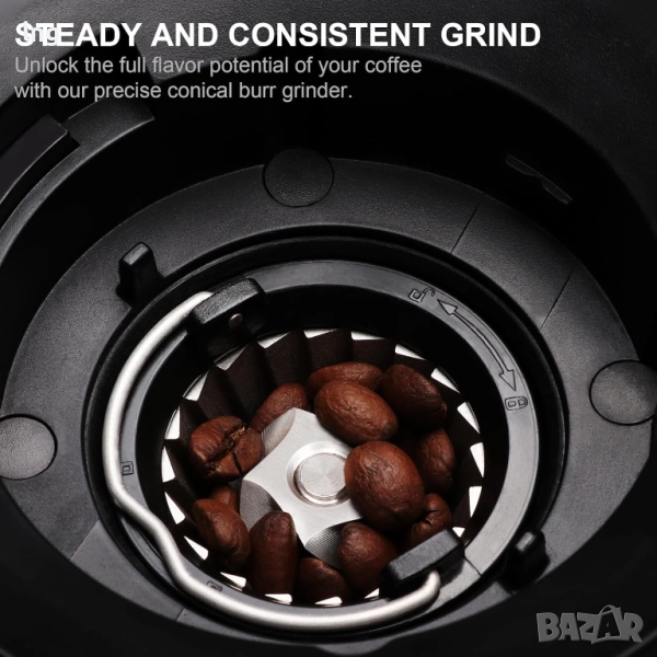 Издръжливи конични ножове: Снабдена с 40 мм конични ножове от неръждаема стомана, тази мелачка гарантира равномерно и прецизно смилане, което извлича максимален аромат от вашето кафе.