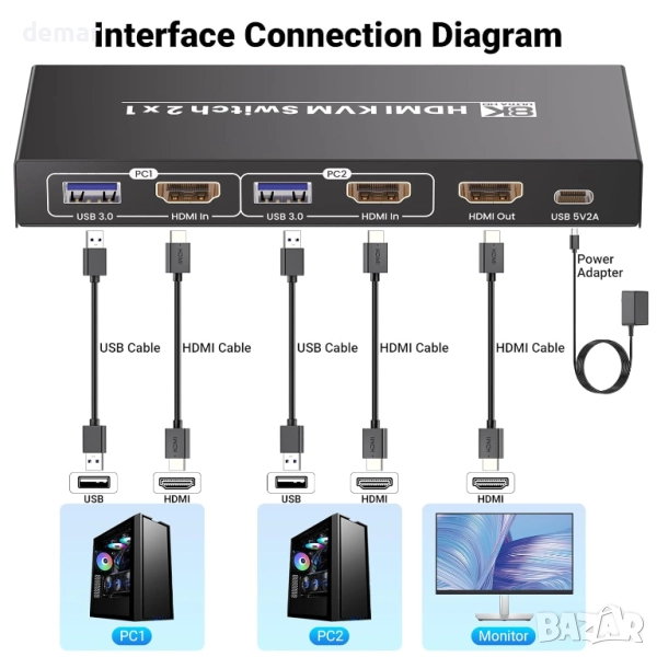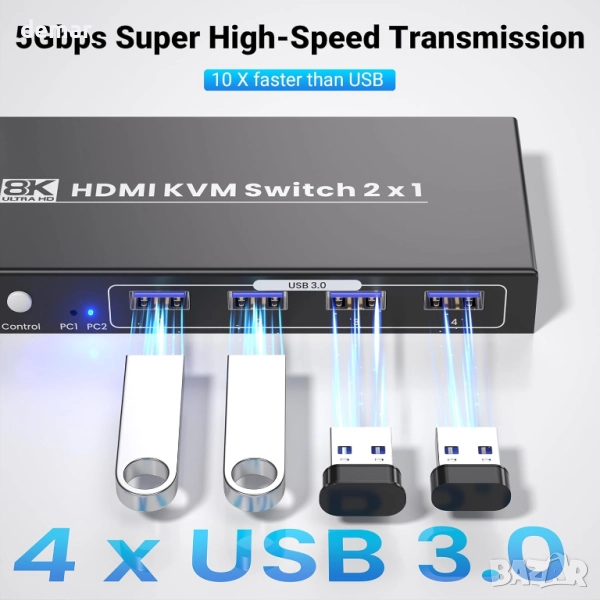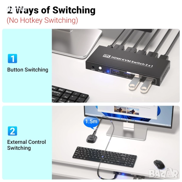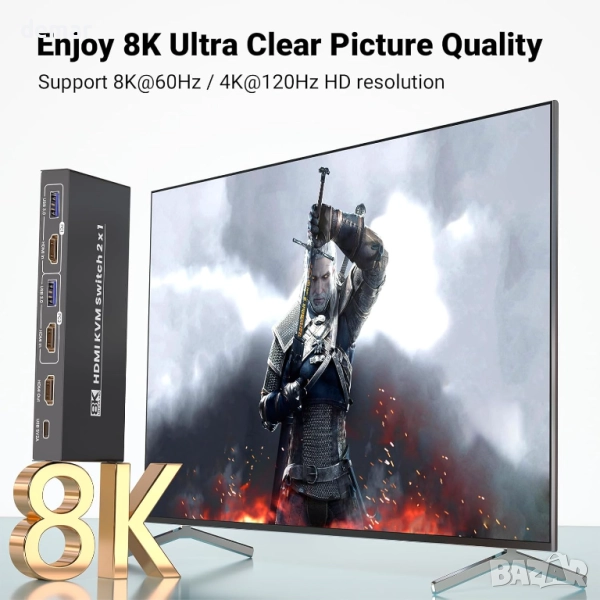 HDMI KVM превключвател 1 монитор 2 компютъра, 8K60Hz 4K120Hz USB 3.0