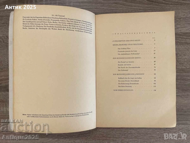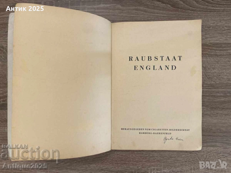 Редък оригинален пропаганден албум от Втората световна война „Raubstaat England“ („Грабителската държава Англия“), издаден през 1941 г. в нацистка Германия. Пълен комплект — всички 125 оригинални стикера са залепени на правилните места. Артикулът има колекционерска стойност за събирачи на милитария и исторически издания.