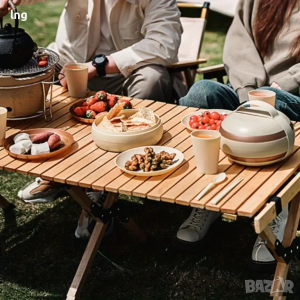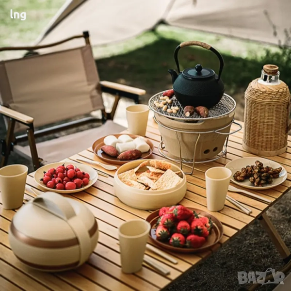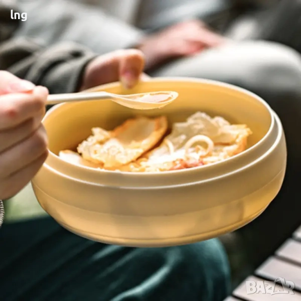 Уникален дизайн: Всеки елемент от комплекта, включително лъжицата-вилица, чиниите, купите и чашите, има изчистен и стилен вид, който добавя визуална привлекателност. Те са не само практични, но и изглеждат страхотно.