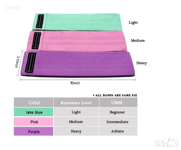 Всяка лента е с универсална дължина от 38 см и ширина 10 см, подходяща за всички нива на фитнес умения. В комплекта получавате три степени на съпротивление: