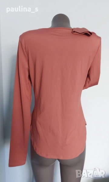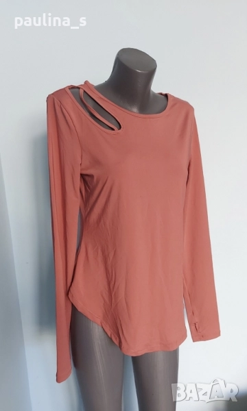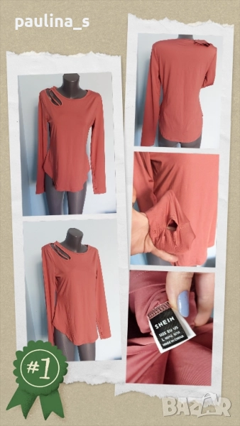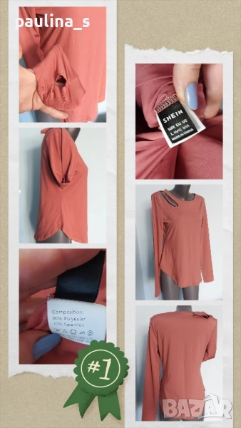 1️⃣. Колаж / L / 3XL - "Shein". Цената е крайна 19,99лв / 10 евро. Еластична блуза тип туника от ликра в екзотичен цвят, с дълъг ръкав и процепи за палците на Шейн. Цветът е Праскова. Силуетът е втален, нова е, без дефекти и етикет, има еластичност и покрива няколко размера, посочени са.