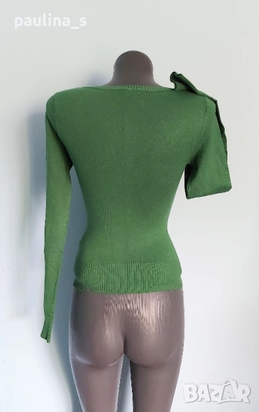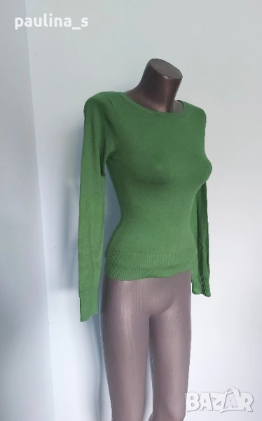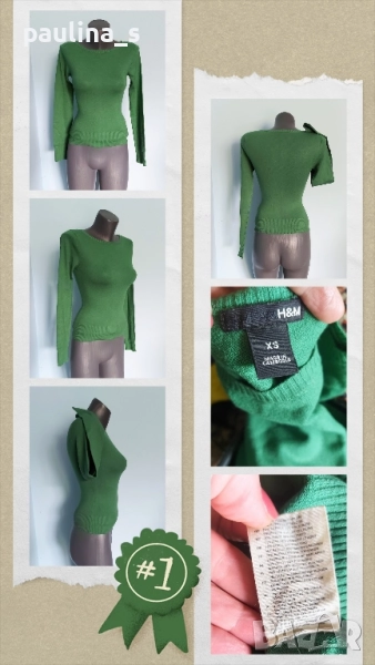 4️⃣. Колаж / XS / XL - "H&M". Цената е крайна. Много еластична брандова блуза с дълъг ръкав в екзотично зелен цвят, унисайз. Моделът е обран, акцентът е в цвета. Материята е много еластична и покрива няколко номера до 2XL. Без дефекти, една бройка, като нова.