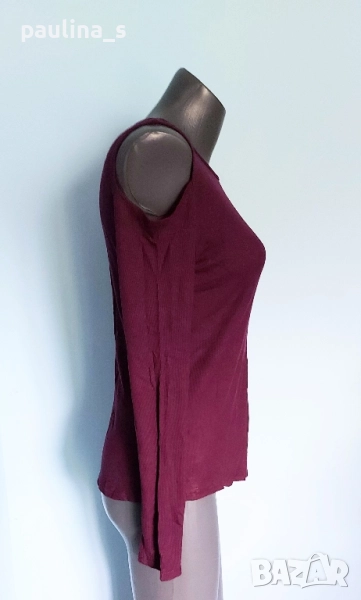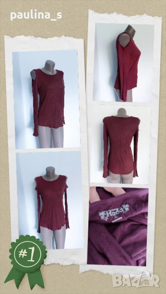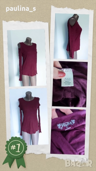 5️⃣. Колаж / L / 3XL / "Mudd". Цената е крайна 19,99лв / 10 евро. Лилава еластична блуза с дълъг ръкав и открити рамене. Долната част е заоблена, като туника. Материята е раион и покрива няколко размера. Без дефекти и етикет, като нова.