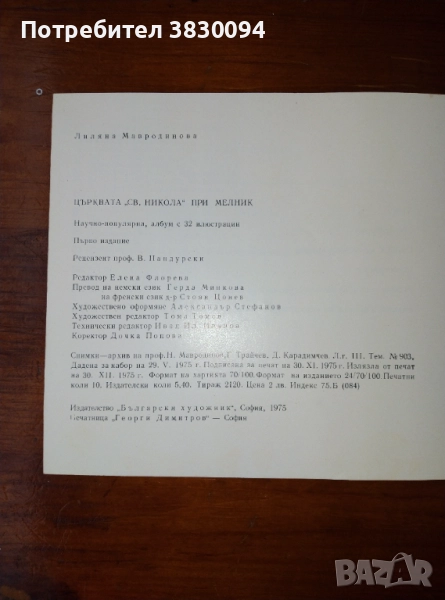 Църквата ,Свети Никола,.при Мелник ,Лиляна Мавродиева,Научно популярен с лбум с32 илюстрации ,Първо Издание София 1975г ,Тираж 2120