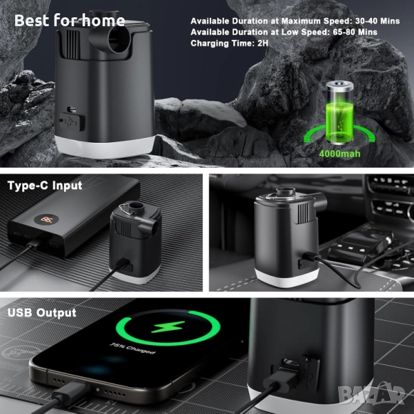 【Подобрена батерия 4000mAh】Снабдена с подобрена акумулаторна батерия 4000mAh, USB акумулаторната въздушна помпа може да се зареди напълно за 2 часа и да работи непрекъснато до 40 минути. Бързият Type-C порт поддържа четири метода на зареждане: външна батерия, лаптоп, зарядно за кола или захранващ адаптер. С едно пълно зареждане може да напомпа 5-7 плувни постелки, 8-12 къмпинг постелки или 3-4 дебели надуваеми матрака. Индикатор за зареждане: Зелен - Напълно заредена; Червен - Зареждане.