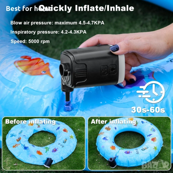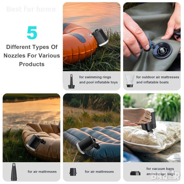 【5 дюзи и универсалност】- Малката помпа за басейн се предлага с 5 дюзи, подходящи за повечето малки до големи надуваеми продукти, като надуваеми подложки за спане, надуваеми възглавници, надуваеми матраци, поплавъци за басейн, къмпинг постелки, плувни пръстени, надуваеми дивани, играчки за басейн и други надуваеми предмети. Може да се използва и за вакуумно компресиране. Просто прикрепете съответната дюза към отвора за надуване или изпускане и натиснете продължително, за да стартирате. Не използвайте непрекъснато повече от 15 минути.