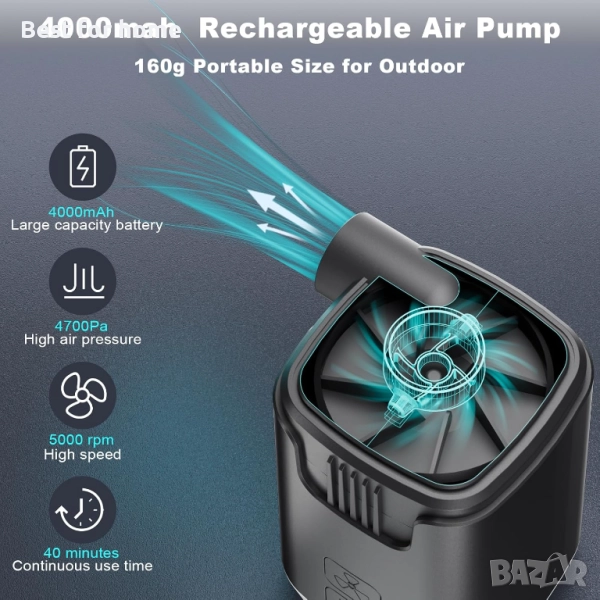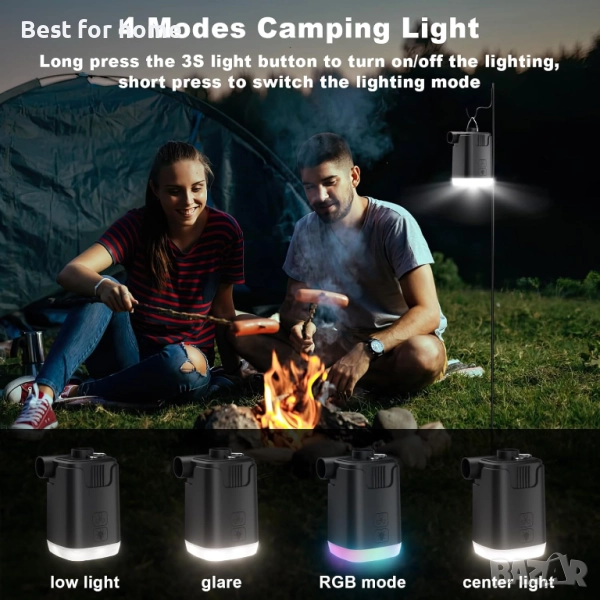 【Преносима USB въздушна помпа 5 в 1】Тегло: 160 г; Размери: 3,5 x 2,1 x 2,1 инча. Миниатюрната въздушна помпа 5 в 1 съчетава функции на помпа, вакуумна помпа, къмпинг светлина, RGB околна светлина и захранване, всичко в едно устройство. Със своя малък и лек дизайн от 160 г и голяма акумулаторна батерия с капацитет 4000 mAh, електрическата въздушна помпа е идеална за различни дейности на открито, като къмпинг, плажни разходки и ежедневна употреба. Също така е идеален подарък за любителите на дейности на открито.