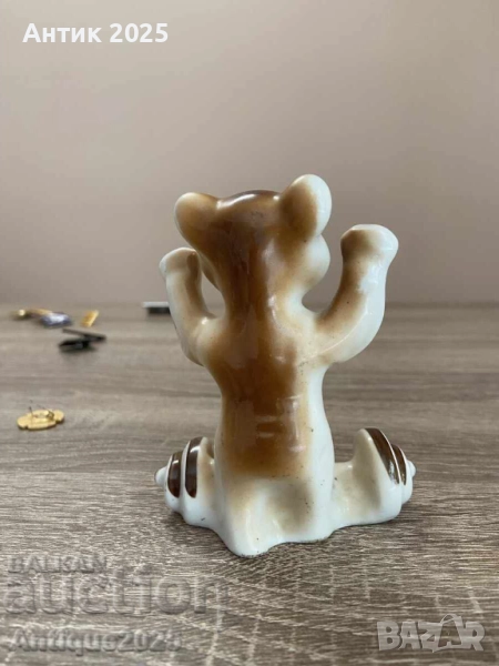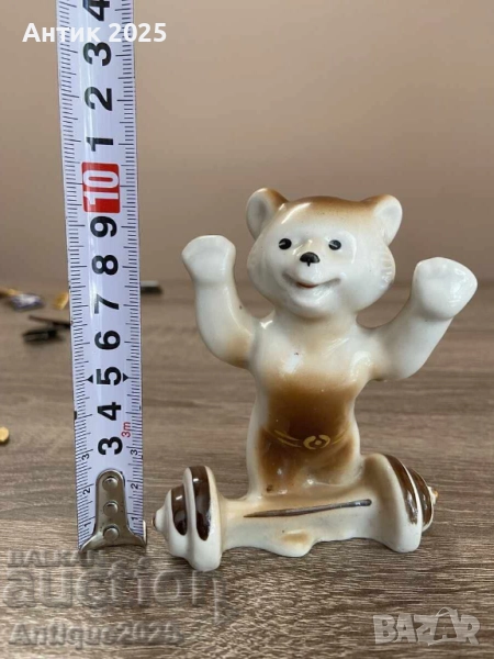 Рядък винтидж сувенир – керамична фигурка на Олимпийското мече, талисман на Летните олимпийски игри през 1980 г. в Москва. Мечето държи щанга – символ на спортната сила. Изработена от керамика, височина около 10 см. В отлично състояние, без забележки. Подходяща за колекционери или като ретро подарък.