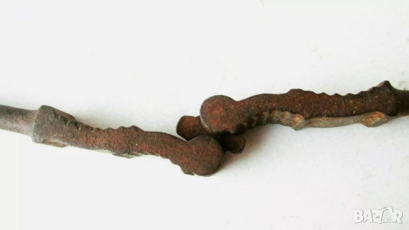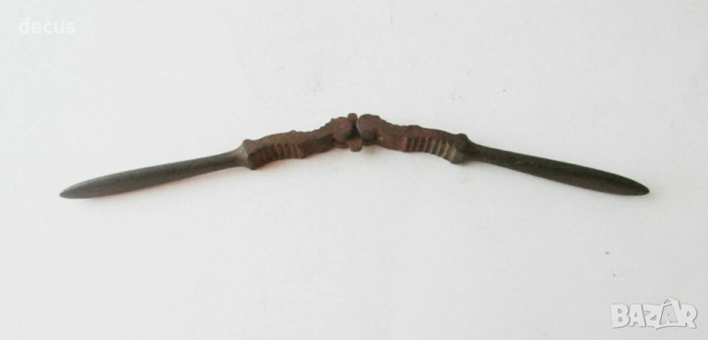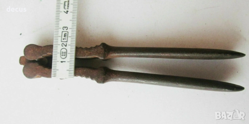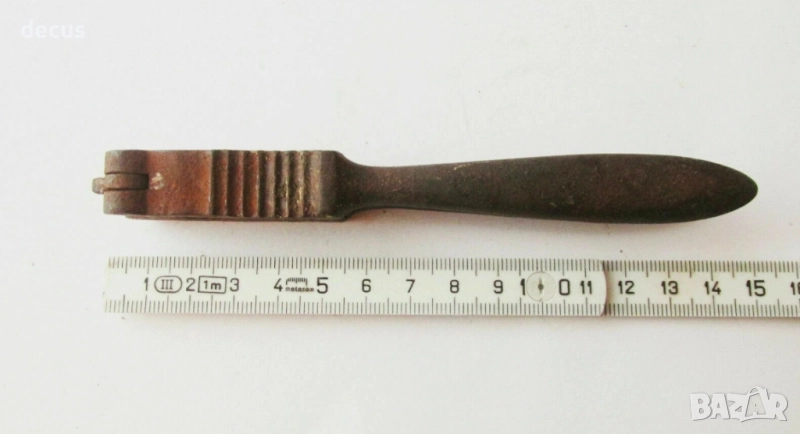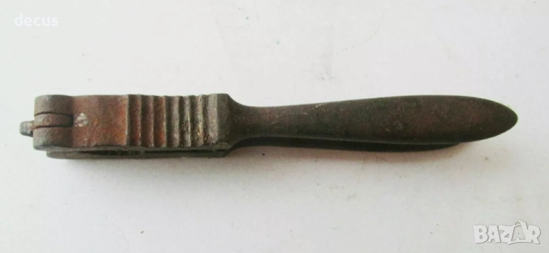 Тази антична метална лешникотрошачка от 19-ти век е рядък и силно колекционерски предмет за любителите на винтидж кухненски инструменти или исторически артефакти. С размери 15 см (5,91"), здравият ѝ дизайн и състарената ѝ патина я правят уникално допълнение към всяка колекция от антични прибори.