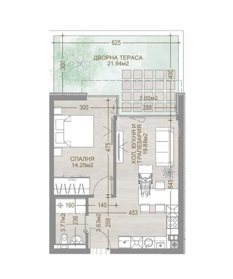 дворна тераса с площ от 21.94 кв.м и излаз от двете стаи.