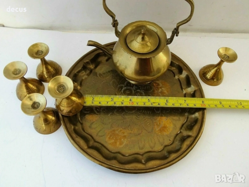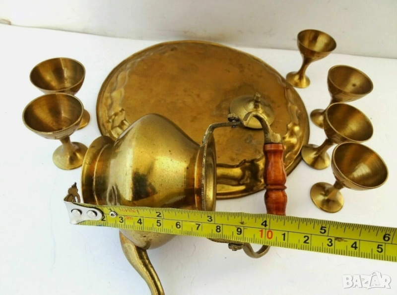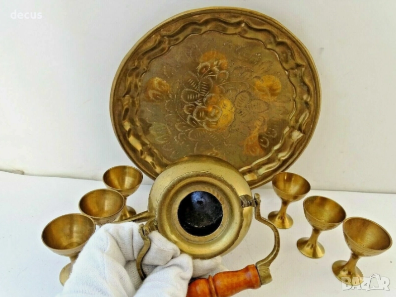 Открийте изящно парче история с този комплект от античен бронз и месинг, включващ красиво изработена чаша, чайник и поднос. Вероятно използван в религиозни или церемониални контексти, този комплект демонстрира сложното изкуство на отминала епоха. Идеален за колекционери на религиозни артефакти, любители на антични металообработки или тези, които търсят уникални декоративни елементи за дома си.