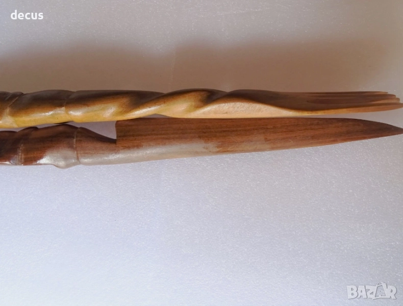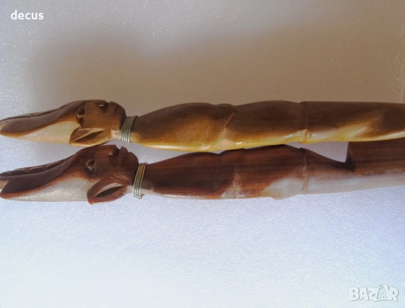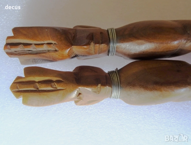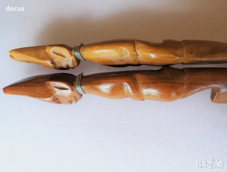 Този винтидж дървен комплект ножове и вилици, ръчно резбовани с глави на местни жители на Африка, е с височина приблизително 34–35 см. Зашеметяващо произведение на африканското изкуство, то е идеално за колекционери на племенни артефакти или уникален кухненски декор, демонстриращ сложна майсторска изработка.