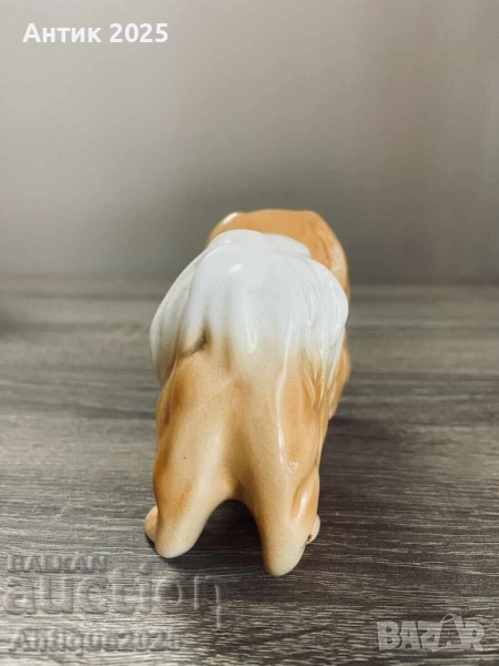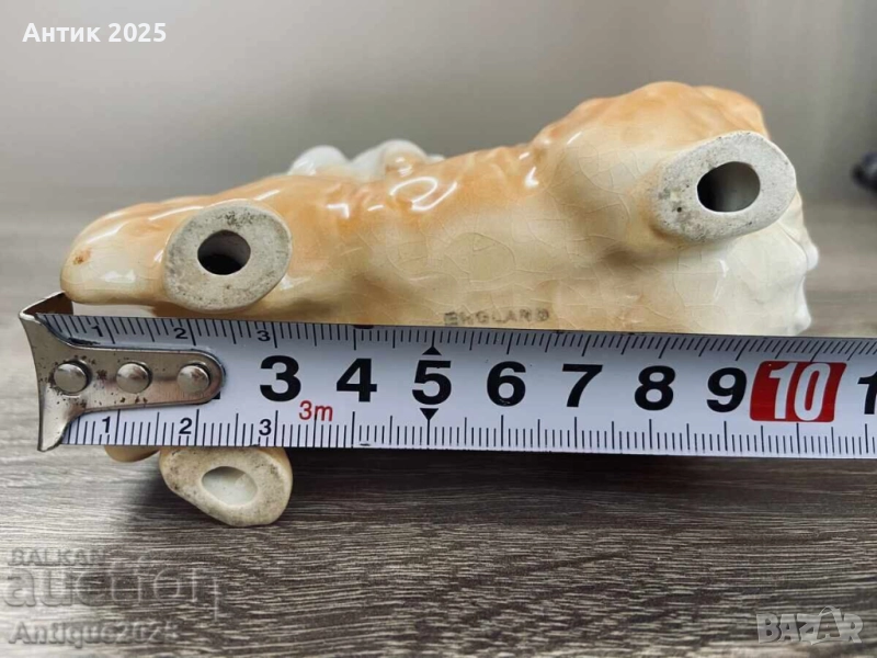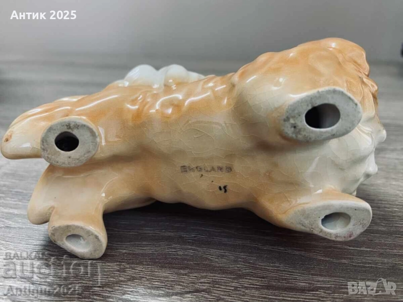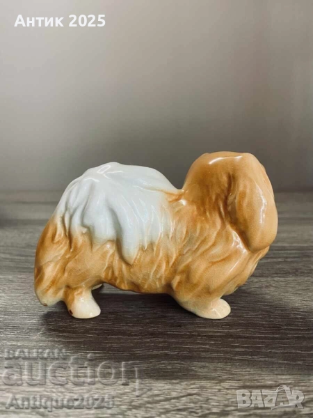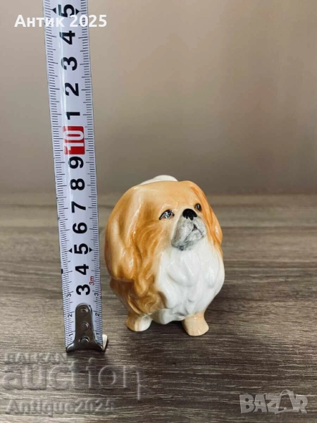 Очарователна винтидж статуетка на куче от породата пекинез, изработена в Англия. Изделието има характерен кракелюр, който свидетелства за възрастта му и му придава особен чар. Отличен подарък за любители на кучета или колекционери на винтидж порцелан. Състоянието е добро, без начупвания или сериозни повреди.