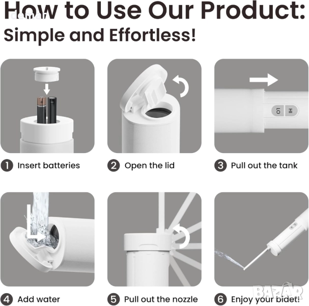 биде е проектирано за пътуване с компактна, лека конструкция и резервоар за вода от 140 мл, което улеснява личната хигиена в движение. Работи с обикновени батерии, което премахва необходимостта от зареждане, и предлага две настройки на налягането с регулируема дюза за комфортно, персонализирано почистване. Неговият водоустойчив и устойчив на протичане дизайн осигурява издръжливост и надеждност, като същевременно е подходящо за мъже, жени и бебета, осигурявайки ефективна хигиенна грижа, където и да е необходима.