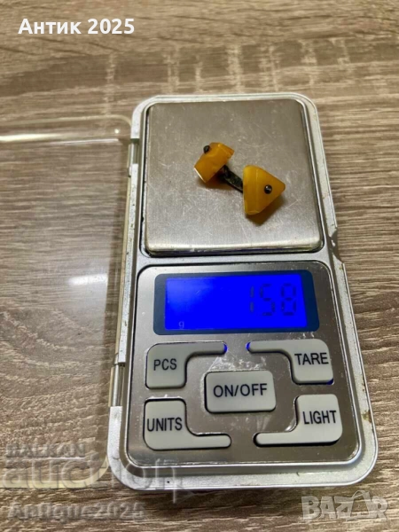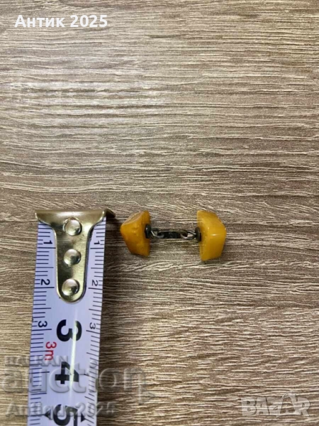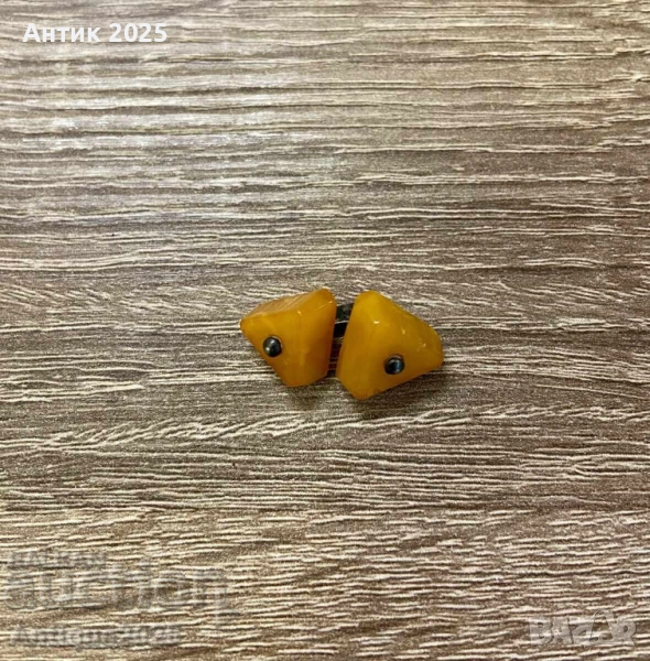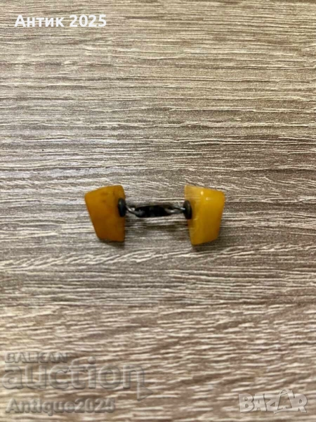 Рядко винтидж копче за ръкавели с елементи от естествен кехлибар в топъл медено-жълт оттенък. Двата симетрични елемента са свързани с метална верижка. Отлично състояние за възрастта си. Подходящо за колекционери, любители на ретро стил или като уникален подарък.