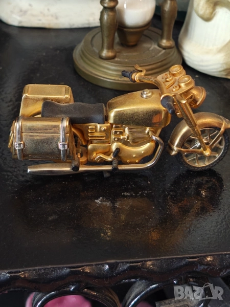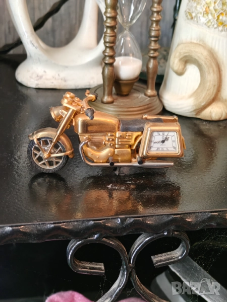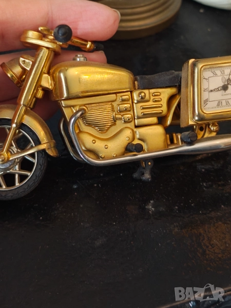 За ценители и колекционери Страхотен и рядък Кормило и гума се движат .Задната я няма така си е направен .Едната му дисага е часовник спря да работи .Дълъг 12 см Крайна цена