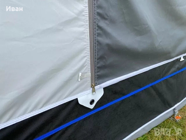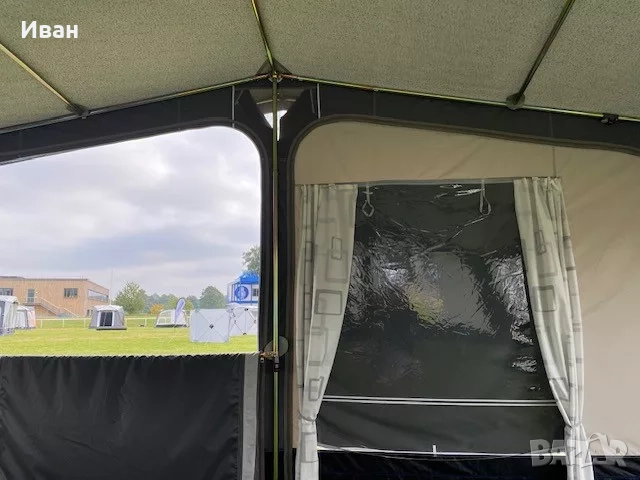 Дишаща непромокаема материя. С двупосочни ципове позволяващи отваряне на всички страници както отгоре-надолу, така и странично. Може да се обособява врата, както отпред така и от двете страни. И четирите страници могат да бъдат частично отворени образувайки веранда или премахнати напълно. Конструкция със стоманени рейки. С комарник. С външни щори.С комплект пердета. С пети за закрепване на таванните рейки към караваната. С пола за под караваната + елиминатор за гумата.С комплект за приковаване (ластици тип стълбички и колчета за земя)