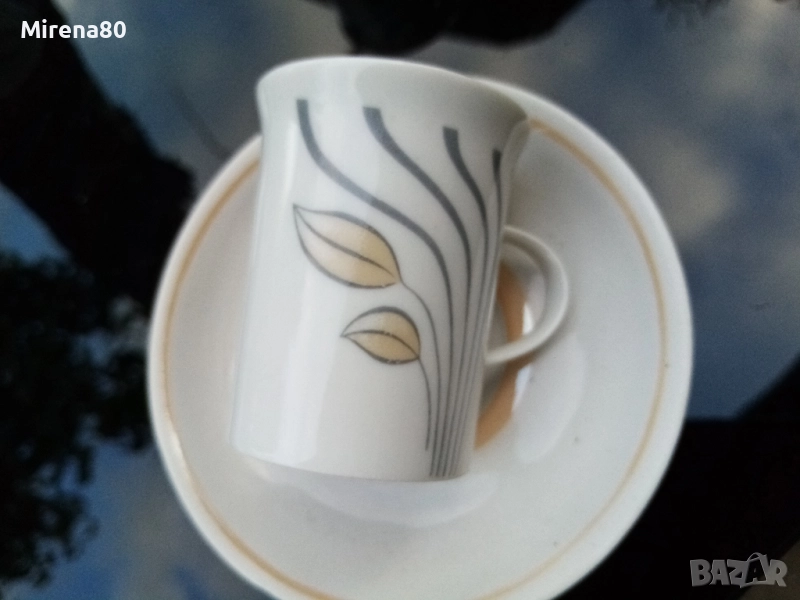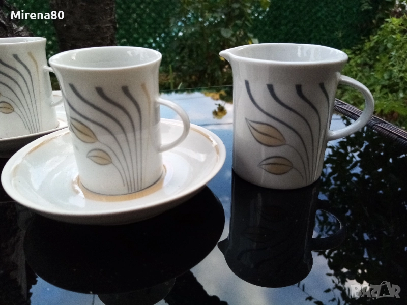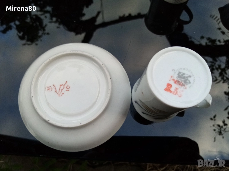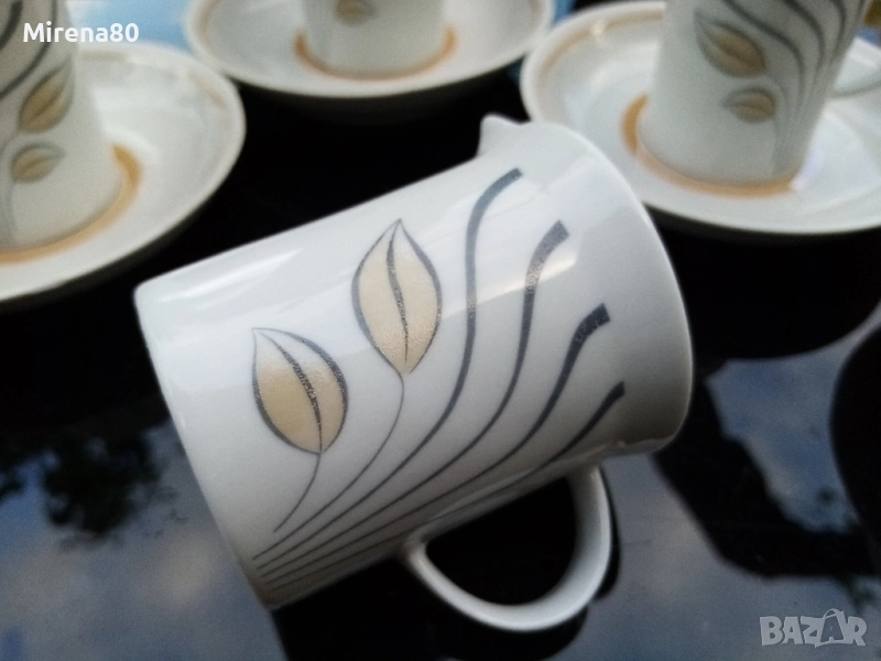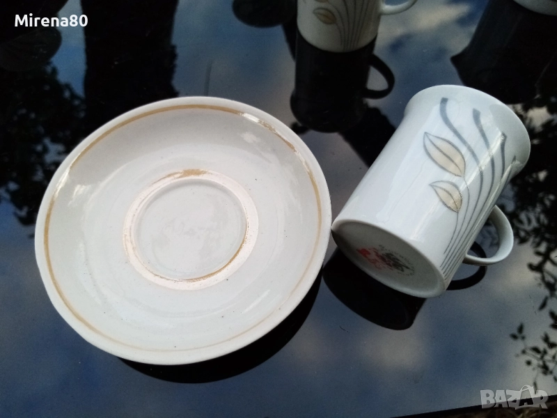 Едно непълно сервизче, за сметка на това ново - извадих ги от хартията им. 5 чашки (60 мл) - производство Разград - фин, лек, тънък порцелан. За жалост си нямаха чинийки, затова ги комплектовах с руски, също новички - бих казала, че си паснаха много добре. И една латиерка за мляко. Маркировки, безупречни.