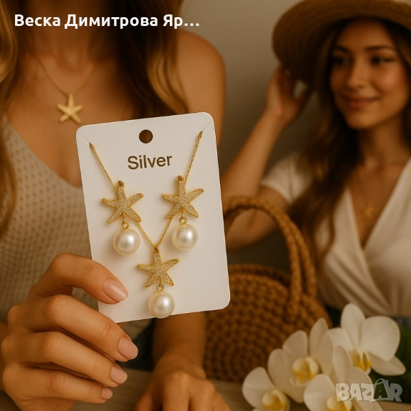 Комплект колие и обеци с морски звезди и перли/ устойчив метал → Обява 51459483