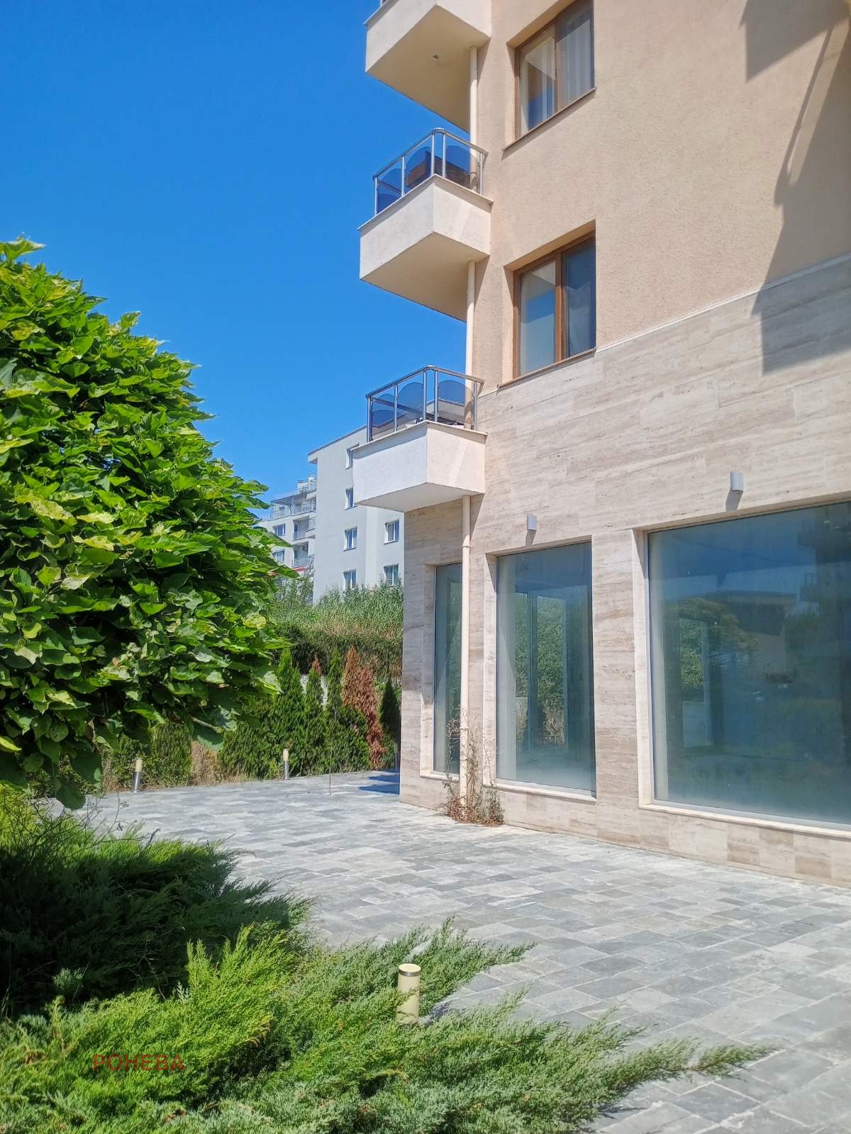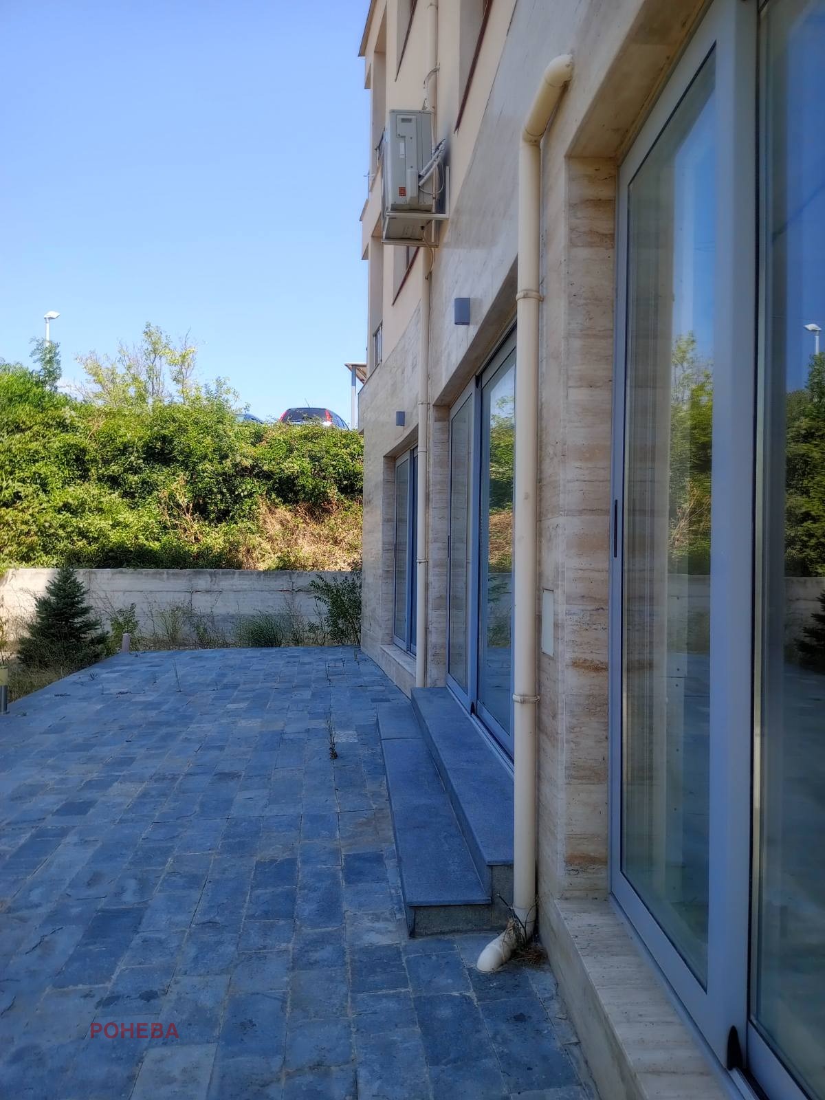 Озеленена веранда с каменна настилка към ресторанта, предлагаща допълнитена площ за маси отвън през топлия сезон. Може смяна на предназначението - имотът е благоприятен за медицински или дентален център, детски център/занималня, козметичен център, кафе сладкарница с пекарна, спортен център, офис площи, банков офис, и др. Травертинова фасада с осветление, възможност за подходящо брандиране. Към имота са включени 623м2 земя с определени места за паркиране.