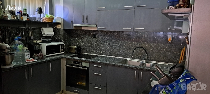 бар столове,кухненски бокс с шкафове ,,Карабулев,,и гранитни повърхности,двукрилен хладилник,вградена фурна,керамични котлони,аспирация,микровълнова,