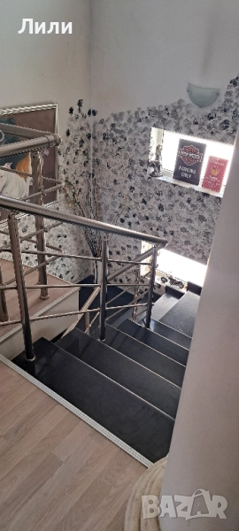 вътрешно стълбище от черен естествен мрамор,алуминиев парапет,стени-гипсокартон.4 спални обзаведени,2 климатика,радиатори,ламиниран паркет.Тераса с изглед към централния вход на къщата и улицата.