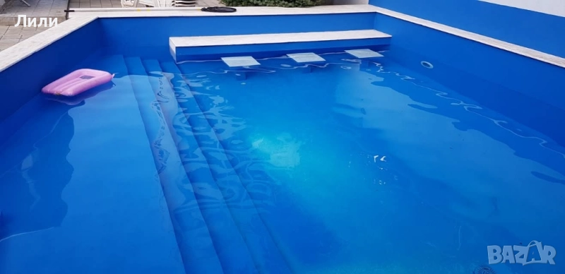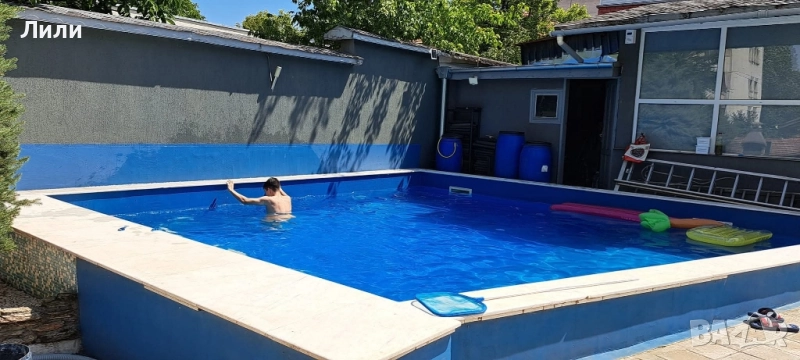 От хола се излиза в просторна гранина с гради нска маса,столове,барбекю,външна чешма,озеленяване,езерце за рибки,тревна площ,басейн с мокър бар-естествен мрамор.