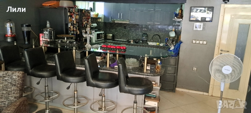 -голям хол(65м2) с мека мебел,телевизор,аквариум,гранитна маса-естествен камък 2/1м.,барплот с шкафове ,,Карабулев,,стъклен бар,естествен гранит,