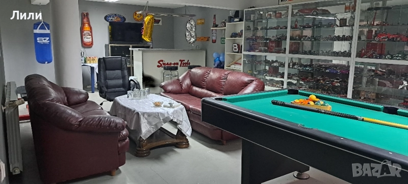 Втори подземен гараж 28м2 с ролетна щора с дистанционно и топла връзка към приземен етаж(84м2),наскоро реновиран,в който има мека мебел,парно,маса(орех),барплот с бар столове,гардероб,стъклени витрини,телевизор и билярдна маса.Подходящо е за фитнес,за парти събирания и всякаква друга дейност.