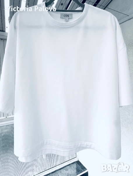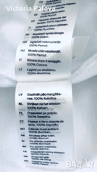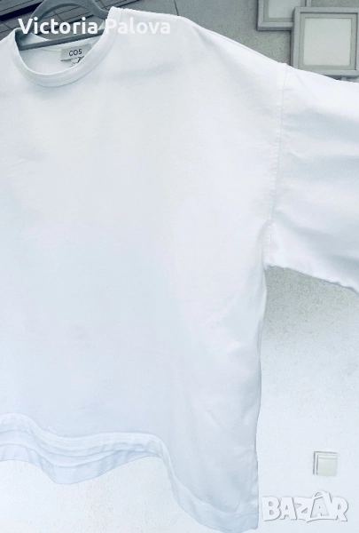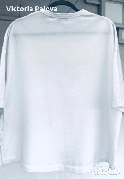 Блуза тип тениска от плътен памук, подходяща и за есента, паднало рамо, широка кройка, дължината отпред е 60см, отзад - 66см. Ръкавът е широк 24см, дълъг 23см. Рамо - 64см, ГО - 65см.Европейски размер М, подходящо и за L.