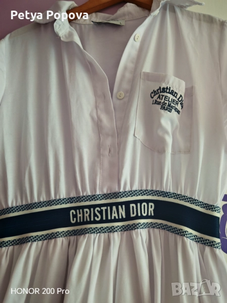 Лятна рокля с логото на Christian Dior. Ластик в талията. Отговаря си на размера. Отдолу е с подплата и не прозира. Няма забележки.