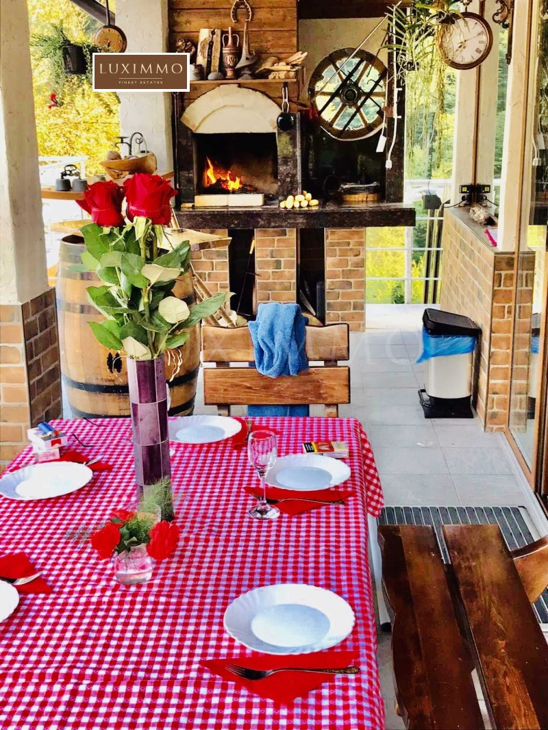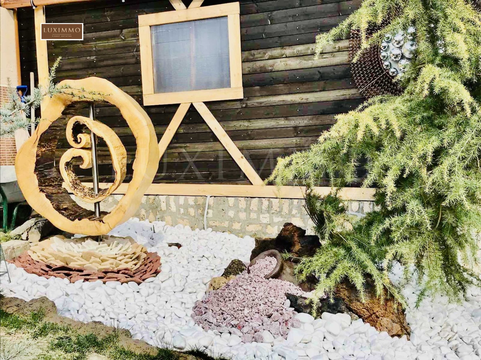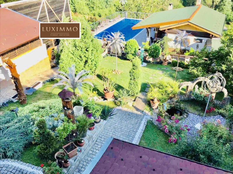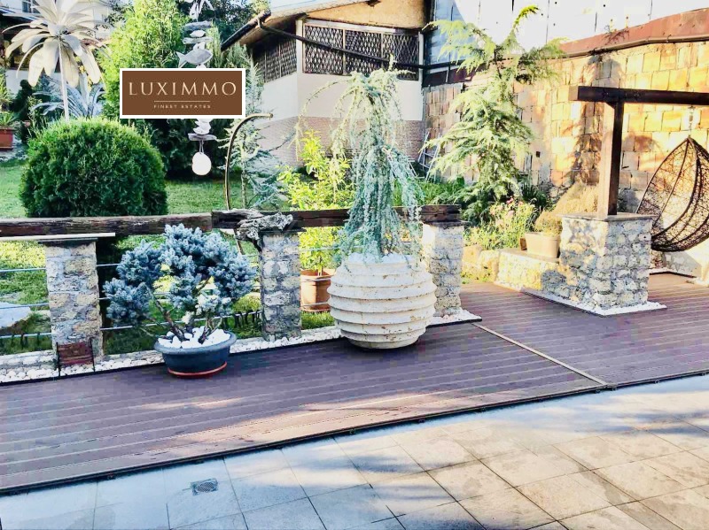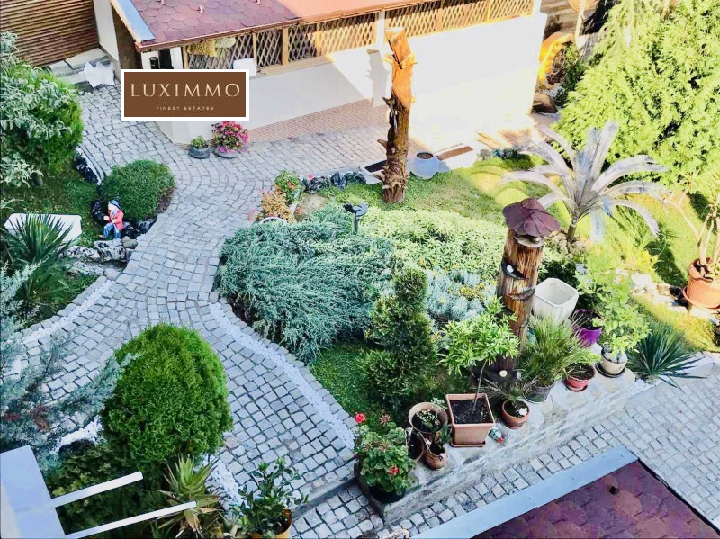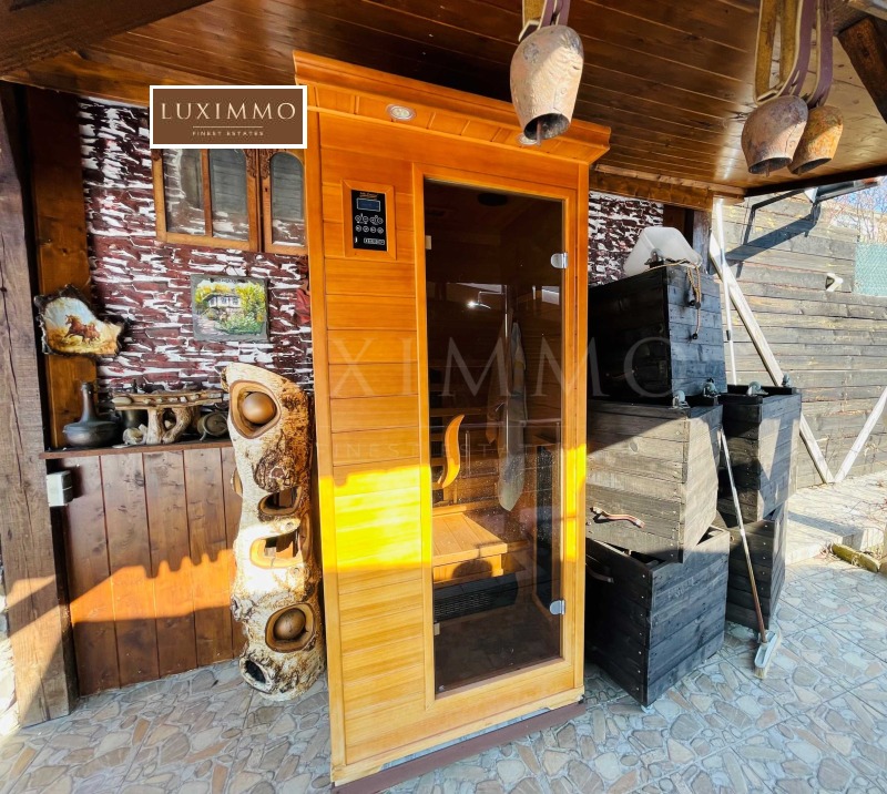 Земята е общо 3500 кв.м от които 600 кв.м са в регулация, а другите са земеделска земя. Къщата има и допълнителни екстри като басейн, сауна и джакузи. Отоплението е решено посредством локално парно, отделно има термопомпи и соларни бойлери. Имотът има и гараж. Къщата е напълно обзаведена и оборудвана за целогодишно живеене. Градината е екзотично и интересно аранжирана, което предава екзотика на имота.