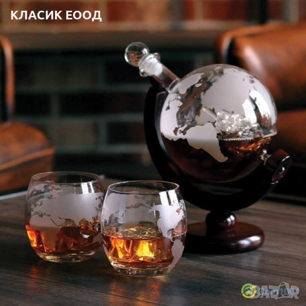 Комплекта включва 2 чаши и декантер на дървена стойка. Макет на стъклен кораб вътре в декантера.