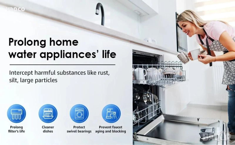 ●【Удължава живота на водните съоръжения】Защитава водопроводната инсталация, кухненското и банното оборудване от замърсявания от частици в градската вода, които могат да запушат кранове за вода, душове, бойлери, перални машини, RO пречистватели за вода и друго оборудване, свързано с водата.