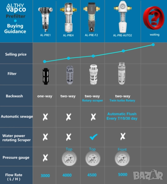 - Тип пречистване на водата: напълно автоматичен предфилтър