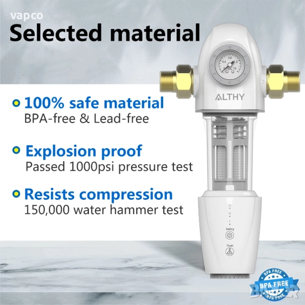 месинг, а експлоатационният живот е повече от няколко години. Здравият прозрачен корпус, произведен в Германия, не съдържа BPA и е преминал теста за воден удар от 150 000 цикъла и теста за най-високо налягане от 1000 psi.