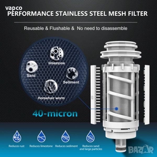 ●【Удължава живота на водните съоръжения】Защитава водопроводната инсталация, кухненското и банното оборудване от замърсявания от частици в градската вода, които могат да запушат кранове за вода, дюзи за душ, бойлери, перални машини, пречистватели за вода RO и друго оборудване, свързано с водата.