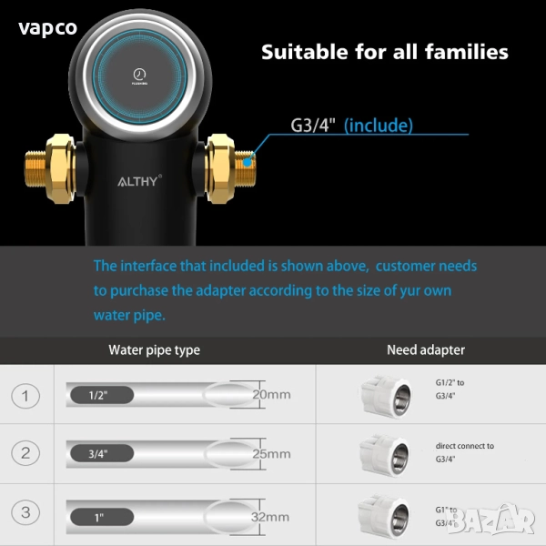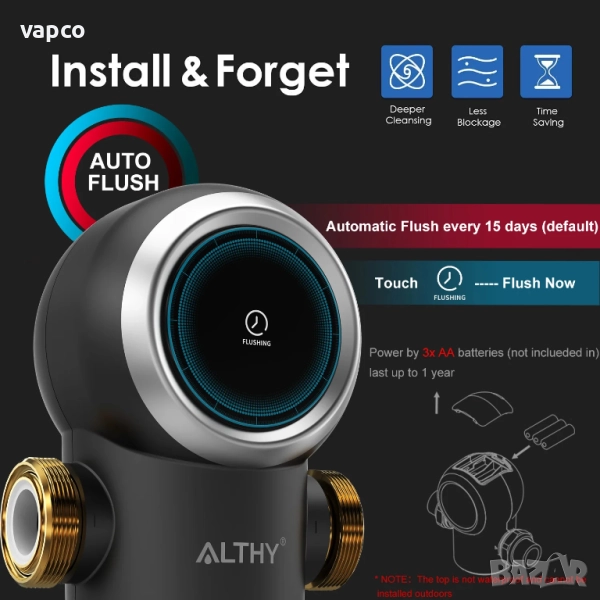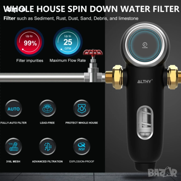 ●【Защита на цялата къща】Предфилтърът за цялата къща ALTHY AL-PRE-AUTO1, с филтър от неръждаема стомана с размер на порите 40 микрона, е проектиран да предотвратява навлизането на частици като пясък, ръжда, варовик и пясък в дома ви.